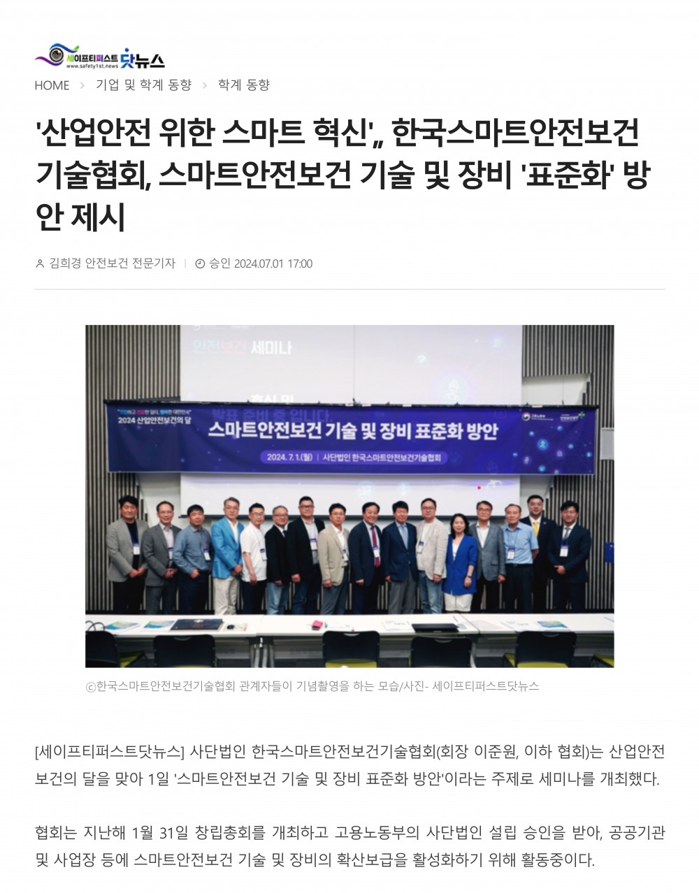 '산업안전 위한 스마트 혁신',, 한국스마트안전보건기술협회, 스마트안전보건 기술 및 장비 '표준화' 방안 제시